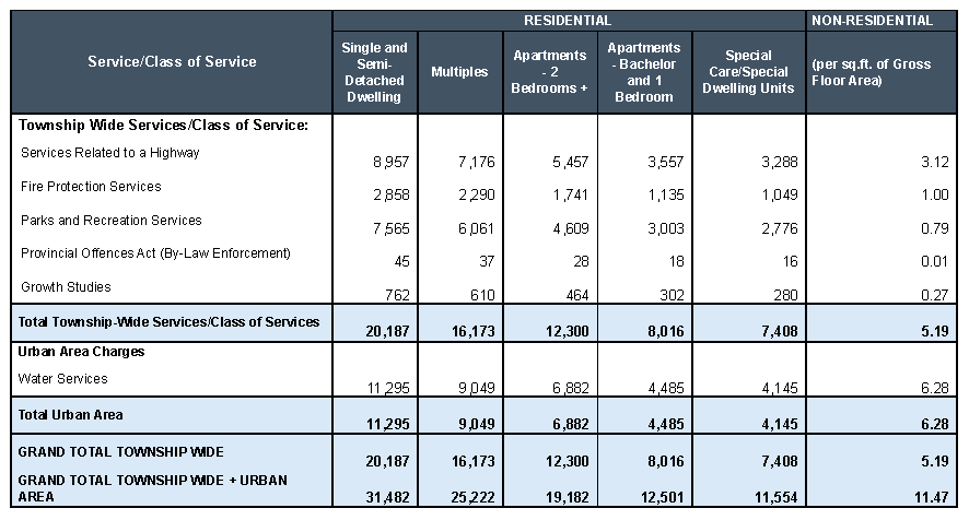 This information is a guideline only. Please contact the Township’s Finance Department prior to initiating any development project at 705-487-2171 to confirm applicable charges and to review the complete By-Law.